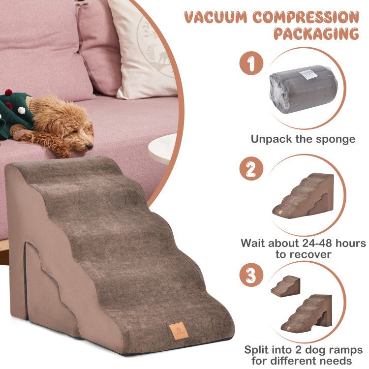 1.Combo Pack and Vacuum Compression Packaging: The package includes 2 stairs-the 5-tier foam dog ramp measures 33" x 16" x 22" (L x W x H), and the 3-tier foam dog ramp measures 16" x 16" x 11" (L x W x H). Besides, they adopt vacuum compression packaging and all you need to do is unpack the sponge and wait about 24-48 hours to recover.