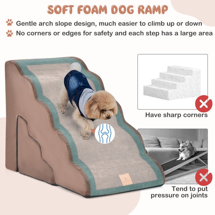 3.Gentle Slope Design and Wide Steps: In contrast to the traditional dog stairs that have sharp corners or tend to put pressure on joints, the foam dog ramp features a gentle arch slope design, which would be much easier to climb up or down. Moreover, there are no corners or edges for safety and each step has a large area, providing ample space for your pet to maneuver.